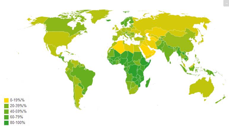 日前,指数研究机构Indy100和 Anchor Pumps根据世界银行发布的1996-2016年期间各国可再生能源比例数据库绘制了全球最终能源消耗中可再生能源使用地图。