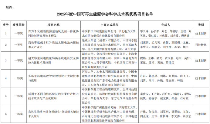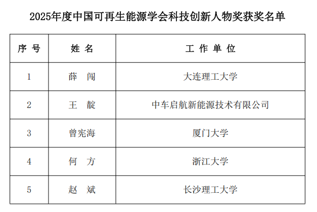 2025年度中国可再生能源学会科学技术奖评审工作已经结束。共评出一等奖10项、二等奖12项、三等奖13项,科学技术成就奖1名,科技创新人物奖5名,青年科技奖10名。现予公布,详见附件。